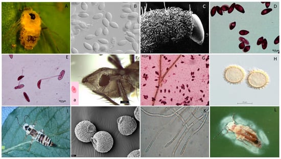 - Sacco, N.E.; Hajek, A.E. Diversity and Breadth of Host Specificity among Arthropod Pathogens in the Entomophthoromycotina. Microorganisms 2023, 11, 1658. [Google Scholar] [CrossRef] [PubMed]