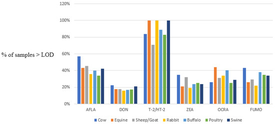 Looking at the percentages of “contaminated” samples, which are samples with mycotoxin percentages higher than the respective LOD, the highest probability was verified for T-2/HT-2 toxins with percentages higher than 70% and equal to 100% in samples of feed for equine, rabbits, and swine.