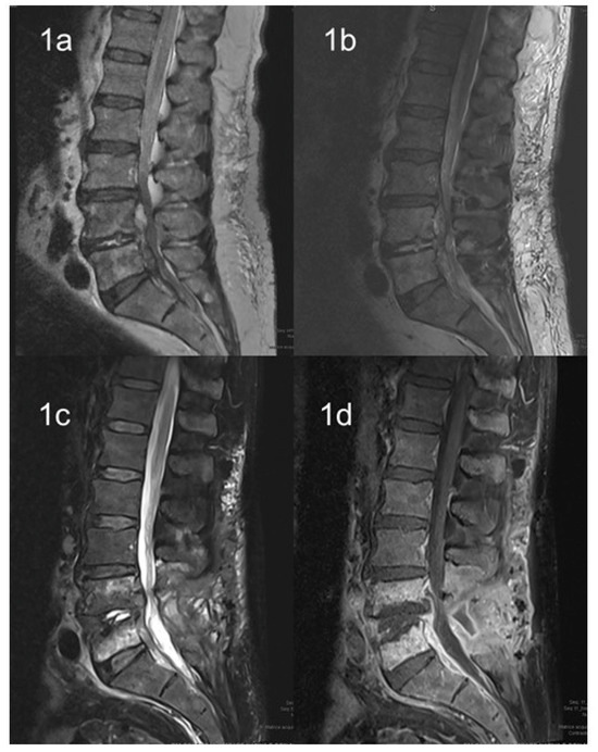 Evolution of MRI in a patient with epidural abscess by L. monocytogenes. (1a) T2 weighted image at baseline; (1b) T2 weighted image after 10 days; (1c,1d) T2 and T1 weighted with contrast at clinical resolution.