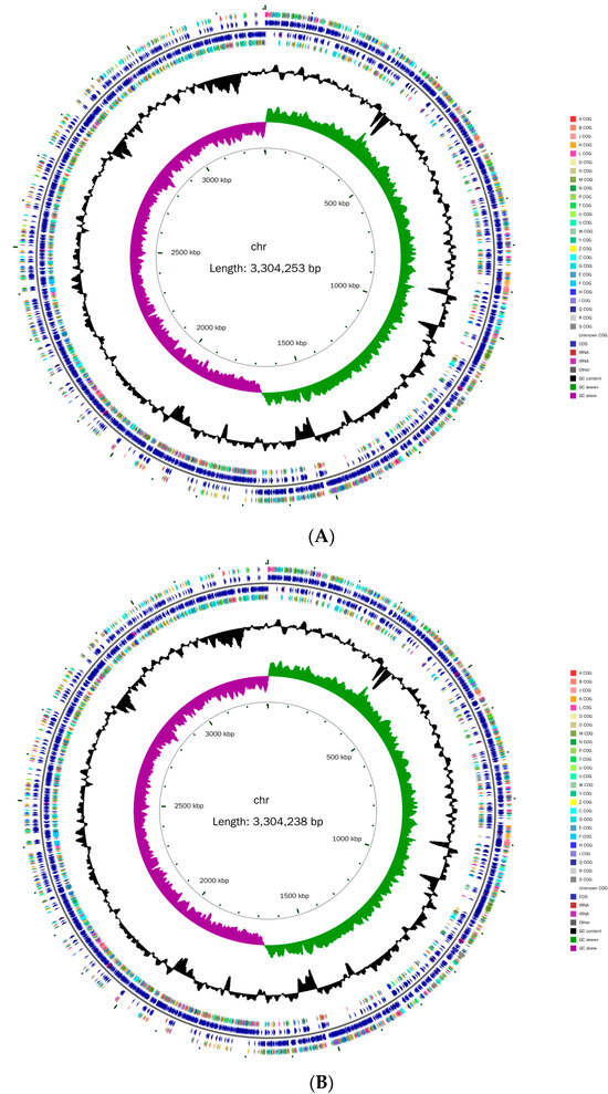 Circular genome map of L. plantarum WLPL21 (A) and ZDY04 (B). Marked information is displayed from the outer circle to innermost, as follows: the first circle represents the scale; the second circle represents the GC sketch; the third circle represents the GC content; the fourth and seventh circles represent the COG to which each CDS belongs; the fifth and sixth circles represent the positions of CDS, tRNA, and rRNA on the genome.