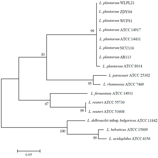 The phylogenetic tree is used to describe the relationships among different species. Based on 16S rRNA genes, L. plantarum WLPL21 and ZDY04 showed 99% similarity with other L. plantarum but less than 85% with other Lactobacillus spp., suggesting that there were greater similarities in L. plantarum than another Lactobacillus spp. (Figure 5). Therefore, our results showed that L. plantarum WLPL21, ZDY04, and ATCC8014 had extremely close relations, but relatively distant relations with L. paracasei, L. rhamnosus, L. fermentum, L. reuteri, L. delbrueckii, L. helveticus, and L. acidophilus.