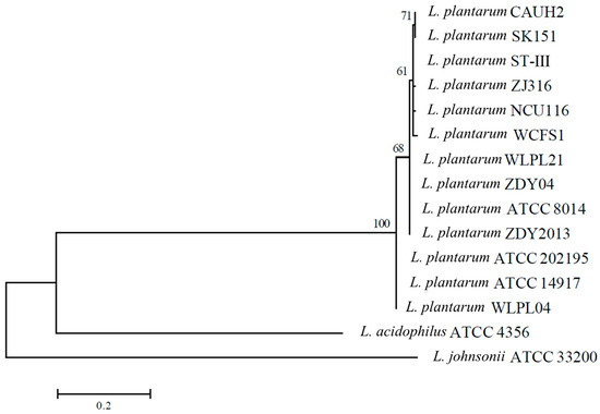 A phylogenetic tree based on 16S rRNA was used to evaluate the affinities among different Lactobacillus spp.; therein, L. plantarum WLPL21 and ZDY04 were extremely similar to the other L. plantarum strains but showed little similarity with other Lactobacillus strains. Correspondingly, L. delbrueckii, Weizmannia coagulans, and L. mudanjiangensis, respectively, showed high similarities with the same species [37,38,39]. As a consequence of their similarity, L. plantarum WLPL21 and ZDY04 had plenty of similar potential probiotic functions. Furthermore, bile salt hydrolase plays a great role in the metabolism of cholesterol, and the results of phylogenetic analysis of L. plantarum WLPL21 and ZDY04 revealed that there were differences among L. plantarum strains and huge distances from the other LABs. Therefore, the genome of L. plantarum WLPL21 and ZDY04 had lots of similarities with the other L. plantarum stains, but some characteristics, especially in bile salt hydrolase, were different.