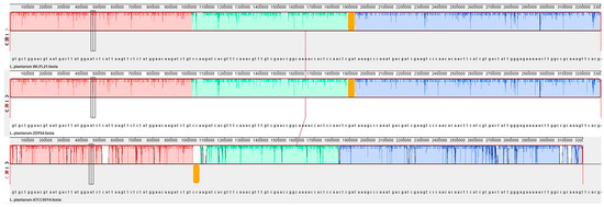 Different plantaricin (pln) genes were identified in the genome of L. plantarum WLPL21 and ZDY04. In addition, those in L. plantarum ATCC8014 were gained from the NCBI database. Then, a gene cluster was obtained from www.chiplot.online (accessed on 6 December 2022).