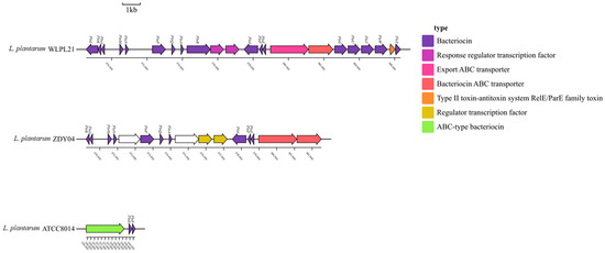 Bacteriocin cluster of L. plantarum WLPL21, ZDY04, and ATCC8014. Colored arrows represent bacteriocin-related genes, white arrows represent genes unrelated to bacteriocins.