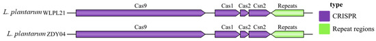 The genes relevant to CRISPR in L. plantarum ATCC8014 were not found in the NCBI database. Three CRISPR structures of L. plantarum WLPL21 and ZDY04 and one gene cluster were found based on genome analysis. Then, a gene cluster was obtained from www.chiplot.online (accessed on 9 March 2023).