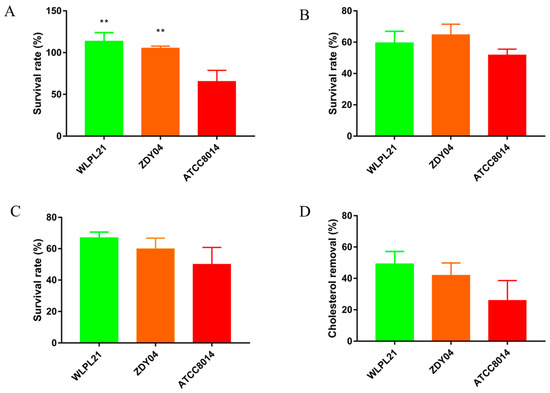 Survival rates of cells under conditions of 1% H2O2 (A), pH 3.0 (B), and 0.3% bile salt (C), and cholesterol removal rates (D) of L. plantarum WLPL21, ZDY04, and ATCC8014. ** p < 0.01, data in WLPL21 and ZDY04 were compared to ATCC8014.