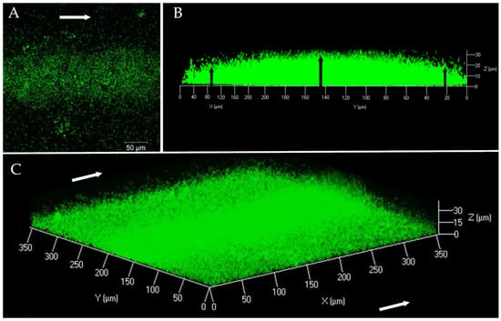 V. harveyi ORM4-GFP biofilm observation at 40× magnification by CLSM after 24 h of culture at 20 °C under a constant flow of LBS (2.5 mL/h). Top view (A), side view (B), and three-dimensional view (C). White arrows represent the LBS flow direction and black arrows indicate the difference in biofilm thickness between the center and the ends.