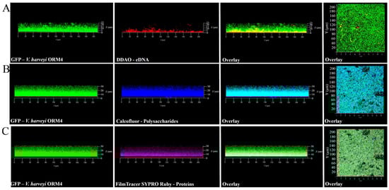 In addition to the observation of V. harveyi ORM4-GFP biofilm-forming cells, the exploration of the biofilm matrix produced by V. harveyi ORM4-GFP cells was performed with specific dyes allowing the visualization of matrix components. Biofilms were stained with Calcofluor White (which binds to β1–3 and β1–4 polysaccharides), DDAO (which binds to eDNA), and FilmTracer SYPRO Ruby (which binds to proteins). CLSM observations enabled the visualization of the distribution of these different components surrounding the bacterial cells. β-polysaccharides and proteins were observed across the entire biofilm thickness (Figure 2B,C), while eDNA were mostly localized in the lower half of the biofilm (Figure 2A). The presence of these different components was previously reported in V. cholerae, V. parahaemolyticus, and V. tapetis biofilms [,,,,].