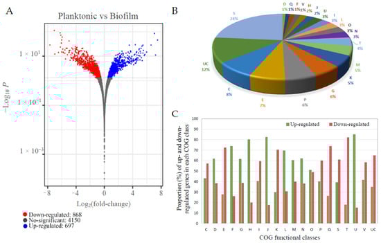 Summary of the V. harveyi ORM4 RNA-seq analysis results. Volcano plot representation of differentially expressed genes (DEGs) in V. harveyi ORM4 biofilm cells versus planktonic cells. The blue and red dots represent significantly up- and down-regulated genes (adjusted p-value < 0.05), respectively, and the grey dots represent the non-differentially expressed genes (adjusted p-value > 0.05) (A). Distribution of DEGs in V. harveyi ORM4 biofilm cells in functional classes (COG) (B). Percentage of up- and down-regulated genes for each COG class in biofilm cells versus planktonic cells (C). COG classes: C: Energy production and conversion. D: Cell cycle control, cell division, and chromosome partitioning. E: Amino acid transport and metabolism. F: Nucleotide transport and metabolism. G: Carbohydrate transport and metabolism. H: Coenzyme transport and metabolism. I: Lipid transport and metabolism. J: Translation, ribosomal structure, and biogenesis. K: Transcription. L: Replication, recombination, and repair. M: Cell wall/membrane/envelope biogenesis. N: Cell motility. O: Posttranslational modification, protein turnover, and chaperones. P: Inorganic ion transport and metabolism. Q: Secondary metabolite biosynthesis, transport, and catabolism. S: Function unknown. T: Signal transduction mechanisms. U: Intracellular trafficking, secretion, and vesicular transport. V: Defense mechanisms. UC: Unclassified.