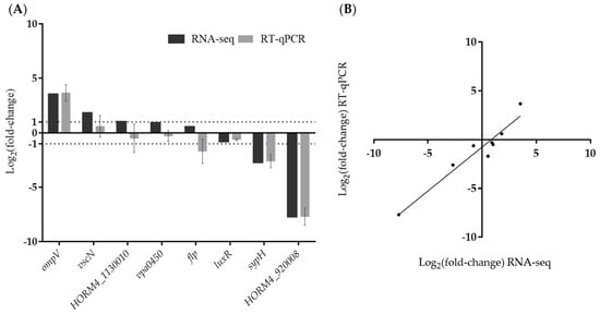 In order to validate the results obtained by RNA-seq analysis, we selected eight genes involved in biofilm formation (flp, luxR, and sypH) [,,], virulence (ompV, vscN, and vpa0450) [,,], or encoding unknown proteins (HORM4_920008, HORM4_1130010) and their relative expression levels (Figure 4) were evaluated using RT-qPCR. These genes showed a wide range of fold-change values in RNA-seq, and were up-regulated (vscN, vpa0450 and ompV), down-regulated (luxR, sypH and HORM4_920008), or not differentially expressed (flp and HORM4_1130010). These eight genes were found to have high Pearson correlation coefficients (0.93) between their fold-change levels assessed by RT-qPCR and by RNA-seq, thereby validating the RNA-seq findings (Figure 4B).