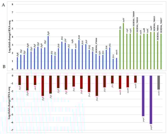 Representation of Log2FC values of 64 DEGs (adjusted p-value < 0.05) related to motility and attachment in V. harveyi ORM4 biofilm cells versus planktonic cells. Positive (A) and negative (B) values of Log2FC are represented in two separated graphics. Red bar represents DEGs encoding the polar flagellum, blue bar represents DEGs encoding lateral flagella, green bar represents DEGs encoding a putative Tad pilus (gene cluster HORM4_700005 to HORM4_700017), and purple and grey bars represent, respectively, DEGs encoding the P pilus (HORM4_920006 and HORM4_920007) and the MSHA pilin protein (HORM4_370020).