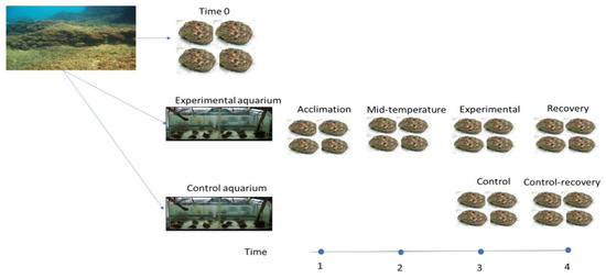 Temperature acclimation experiments were conducted over 1 year (Table 1A). In every experiment, oysters were removed with hammer and chisel from the substrate at Sdot-Yam site (32°29′26.0′ N 34°53′09.4′ E, 3–6 m depth) on the Israeli Mediterranean coast, placed into seawater buckets, and immediately transferred to the marine laboratory at Mevo’ot Yam, Mikhmoret. (Figure 1, Table 1). For each experiment, five oysters were randomly sacrificed for microbial analysis (procedure detailed below) and assigned to an inception group (time 0), thereby accounting for possible confounding effects of collection. The remaining oysters were divided into an experimental (300 L) and a control (150 L) aquaria. Each aquarium was supplied with a flow-through of 3 L/min while maintaining temperature, pH (8.3), and salinity (3.8%), corresponding to ambient Mediterranean conditions. Temperature was monitored four times a day (HOBO Pendant® Temperature/Light 8K Data Logger, ONSET, Bourne, MA, USA), and ammonia, nitrite, nitrate, and phosphate levels were measured twice a week (API® test kit, Livonia, MI, USA). Oysters were maintained under ambient temperature for one week of acclimation, after which four to five oysters were randomly retrieved and sacrificed for microbiome analysis to control for acclimation effects. The experimental aquarium was then exposed to a modified temperature change at a rate of 2 °C per day until reaching the desired temperature (Table 1A), while the control aquarium remained at ambient temperature. Following a two-week exposure to the target temperature, five to ten oysters from both experimental and control aquaria were sacrificed for microbiome analysis. The final phase was an adjustment of temperature in the experimental aquarium at a rate of 2 °C per day until returning to the ambient seawater temperature, at which point the oysters were sustained for an additional two weeks and then sacrificed for microbiome analysis as a recovery group. Concurrently, five oysters from the control aquarium were sacrificed for assessment as a ‘control-recovery’ group (allowing a comparison between the oysters that recovered from a temperature shift and ones that began the experiment at the same time but did not experience any temperature shift). The ‘extreme cold’ experiment (see above) lacked a recovery phase due to insufficient oyster supply.