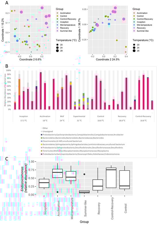 Effect of a winter-to-summer temperature shift on gill microbiome. (A) PCoA of weighted/unweighted unifrac matrices. (B) Relative abundances of dominant genera (appearing in at least 2 samples with a minimum RA of 5%). (C) Endozoicomonas relative abundance across all treatment groups.
