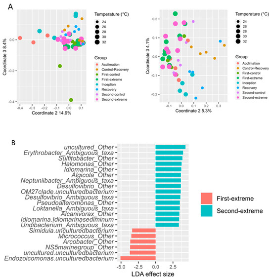Effect of extremely high temperatures on gill microbiome. (A) PCoA of weighted/unweighted unifrac matrices. (B) Taxa differentially represented in the first-extreme (32 degrees) vs. second-extreme (33 degrees) treatment groups, detected with LEfSe.