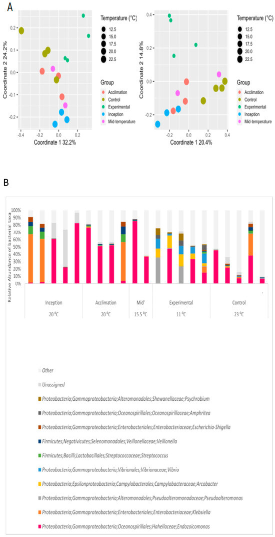 Oysters were exposed to Western Mediterranean winter seawater temperatures typical to the coastal sites of Spain and Northern Italy [27,28] in order to determine the possible effects of this temperature on S. spinosus microbiota should its invasive range expand to include that region. Oysters were collected during winter (20 °C) and gradually exposed to 11 °C. In contrast to all previous experiments, all five oysters from the experimental group (11 °C) showed stress symptoms, manifested in keeping their valves closed most of the time, and two of them hardly responded to any external stimulus. The 12 control oysters remained normal-looking throughout the experiment. A divergence in the gill microbiome composition of the stressed oysters compared to the other groups was observed by PCoA (Figure 4A) and corroborated by PERMANOA (temperature effect: p = 0.001, R = 18%; group effect: p = 0.03, R = 28%).