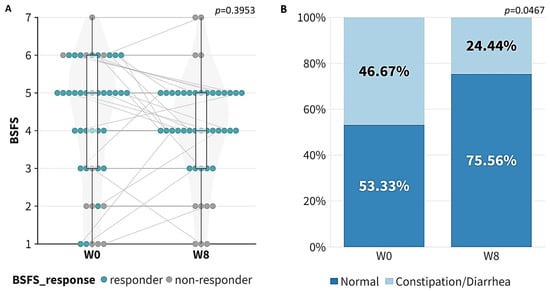 Following an 8-week probiotic intervention, a higher proportion of participants had their BSFS score fall into the normal range when compared to the baseline at week 0. Unsurprisingly, the BSFS score did not exhibit a unidirectional change after the intervention (p = 0.3953, Figure 1A), as the BSFS is not a continuous scale of measurement. However, there was a significant difference in the distribution of the “Normal” and “Constipation/Diarrhea” groups between week 0 and week 8 based on the BSFS score (p = 0.0467, Figure 1B). A total of 10 out of 21 psoriasis patients (47.6%, 95% CI: 28.3% to 67.6%) with an abnormal BSFS at week 0 showed improvement by week 8, while a total of 34 out of 45 psoriasis patients (75.6%, 95% CI: 61.2% to 85.9%) achieved a normal BSFS score by week 8.