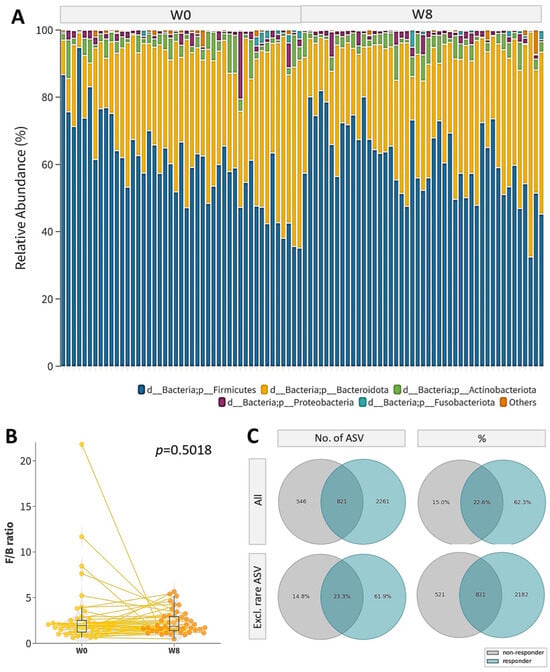 Gut microbiome composition of psoriasis patients. (A) Relative abundance of phyla at week 0 (W0) and week 8 (W8); (B) boxplot of Firmicutes/Bacteroides (F/B) ratio at week 0 and week 8; Yellow line indicated the paired data points at week 0 (W0) and week 8 (W8); (C) Venn diagram of number (left) and percentage (right) of all ASVs (top) and with rare ASVs excluded (bottom) within responder and non-responder groups at week 0. Rare ASVs were defined as ASVs that occurred in only one sample.