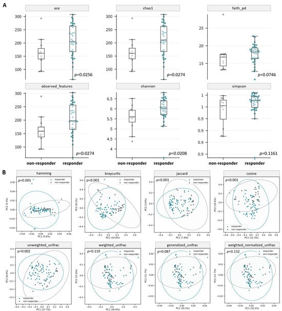 Significant differences in the gut microbial profile between the responders and non-responders at week 0 and week 8 were observed. A total of 3628 unique amplicon sequence variants (ASVs) were identified at week 0, of which 104 are rare ASVs with only one count in any given sample included in this analysis. These ASVs belonged to 12 phyla, 20 classes, 49 orders, 90 families, 241 genera, and 570 species. The participants in the responder group tended to harbor more ASVs than the non-responder group (Figure 2C). Compared with the non-responders, the gut microbiome of the responders tended to harbor higher alpha diversity. (ACE Index: p = 0.1223; Chao 1 Index: p = 0.1288; Faith’s PD: p = 0.1823; observed OTUs: p = 0.1191; Shannon Diversity: p = 0.1500; Simpson Diversity: p = 0.1043; Figure S4). After the 8-week probiotic intervention, significantly higher diversities were observed in the responders in terms of the ACE Index (p = 0.0256), Chao 1 Index (p = 0.0274), observed OTUs (p = 0.0274), and Shannon Diversity (p = 0.0208) (Figure 3A). The ADONIS test also reported a statistically significant difference in beta diversity between responders and non-responders based on the Hamming distance (p < 0.001), Bray–Curtis (p < 0.001) dissimilarity, Jaccard index (p < 0.001), cosine similarity (p < 0.001), and unweighted UniFrac distance (p = 0.002) (Figure 3B and Table S1).