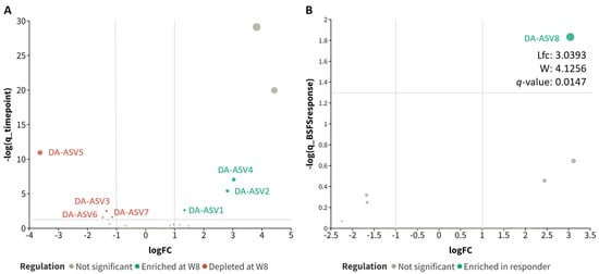 Differentially abundant ASVs using ANCOM-BC2 with significant q values. (A) Differentially abundant ASVs correlated solely with timepoint; (B) differentially abundant ASVs correlated solely with probiotics response. Log fold change (Lfc), test statistics (W). The taxon names of the DA-ASV are listed in Table S2. The size of dots was proportional to the −log q values.