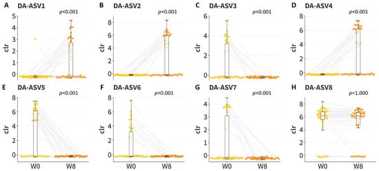 Boxplots of centered log ratio (clr) transformed abundance of differentially abundant ASVs correlated solely with timepoint at week 0 (W0) and at week 8 (W8). (A) DA-ASV1; (B) DA-ASV2; (C) DA-ASV3; (D) DA-ASV4; (E) DA-ASV5; (F) DA-ASV6; (G) DA-ASV7; (H) DA-ASV8. Grey line indicated the paired data points at week 0 (W0) and week 8 (W8).