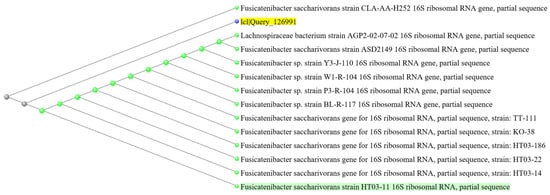 In addition, one ASV (DA-ASV8: Fusicatenibacter, adjusted p = 0.0147, BLAST aligned to Fusicatenibacter saccharivorans, Figure 6) was identified to be enriched in the responder group at week 0 and week 8 (Figure 4B and Table S3). Although there was no significant difference between the centered log ratio (clr) transformed abundance in either responder or non-responder groups after the probiotics supplementation (Figure 7C,D), the differences between the responders and non-responders at either timepoint were statistically significant (Figure 7A,B). The extent of the difference between the non-responders and responders at week 8 was also larger than that at week 0 (mean fold change: week 0 = 1.730, 95% CI: 0.967 to 4.894; week 8 = 2.854, 95% CI: 1.355 to 33.556). The functions and impacts of these ASVs of differential abundance on human health may provide insights into the improvement of GI comorbidities and the varying responses to the 8-week probiotic intervention, as detailed in the discussion section.