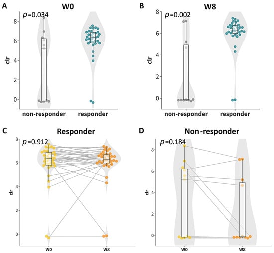 Boxplots of centered log ratio (clr)-transformed abundance of differentially abundant ASVs correlated solely with probiotics response (DA-ASV8: ab094218743ac1a1e8e57fad028130fd, Fusicatenibacter saccharivorans): (A) boxplot of responders and non-responders at week 0 (W0); (B) boxplot of responders and non-responders at week 8 (W8); (C) boxplot of responders at week 0 and week 8; (D) boxplot of non-responders at week 0 and week 8. Grey line indicated the paired data points at week 0 (W0) and week 8 (W8).