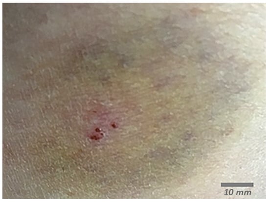 Self-captured cell phone image of bite site, 4 days after the bite. Blue ring appeared at 24 h post bite and turned into a bruise at Day 4.