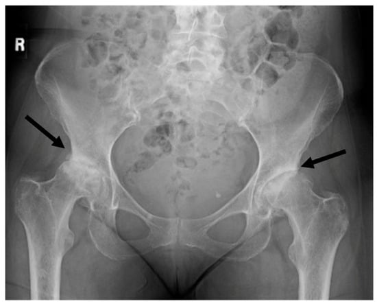 The community of progressive physicians who work to help such patients are familiar with the lack of accurate diagnostic techniques for vector-borne disease and often empirically treat based on clinical presentation. Based on her symptoms consistent with Bartonella infection, the patient was prescribed clarithromycin and rifampin treatment based on the known antibiotic sensitivity of Bartonella []. Despite these antibiotics, she continued to decline. Due to ongoing neurological symptoms, her primary care clinic referred her for evaluation at clinics specializing in multiple sclerosis (MS) and amyotrophic lateral sclerosis (ALS), both of which were ruled out. She was then offered psychological counseling and physical therapy. Her physical therapist recommended a wheeled walker in the summer of 2020. In October of 2020, she was told that she should think about taking a vacation with family as she probably would not be able to do so in the future. She reported to multiple physicians that her hips sounded like popcorn whenever she walked or climbed stairs. In early 2021, her physical therapist recommended she use a wheelchair. At this point, her primary care doctor ordered hip X-rays (Figure 2).