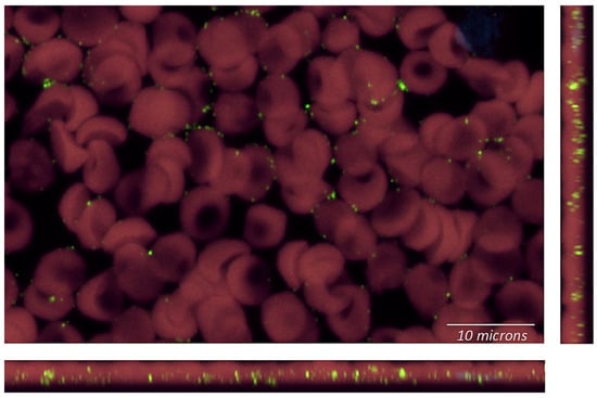Blood smear stained with a fluorescently tagged RNA probe (FISH) for Bartonella henselae. Endogenous fluorescence, captured in the green and red channels, of bi-concave red blood cells, which are pseudo-colored red. The B. henselae RNA FISH signal is pseudo-colored green. This image is a 3.8 micron-thick Z-stack projection captured via single-photon confocal microscopy (Nikon PLAN APO 60X/1.42 oil).