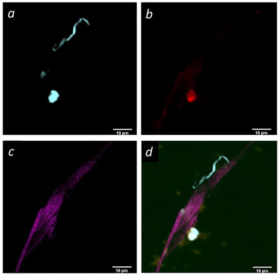 Bartonella henselae and a spirochete-like organism were both detected in this buffy coat smear sample. The smear of the isolated buffy coat reveals (a) the DAPI stain of nucleotides (pseudo-colored aqua); (b) the fluorescent-tagged RNA probe (FISH) for Bartonella henselae (pseudo-colored red); (c) the endogenous fluorescence of the possible biofilm structure captured in the far-red channel (pseudo-colored magenta) and (d) the merged image. Image is a 3.8 micron-thick Z-stack projection captured via single-photon confocal microscopy (Nikon A1R, 60X PLAN APO 60X/1.42 oil objective).