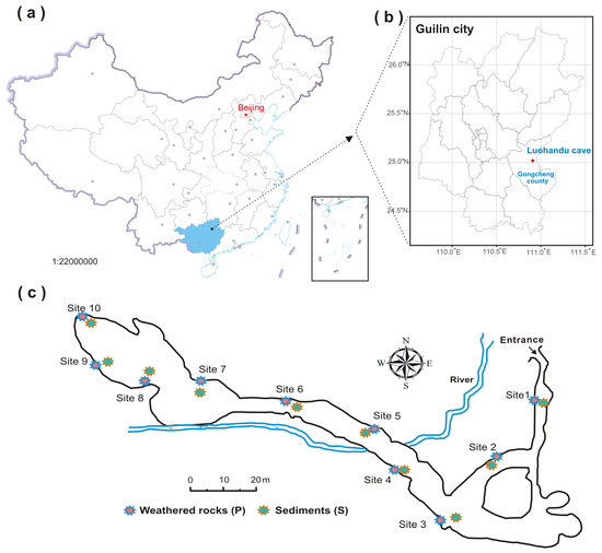 - Wang, Y.; Cheng, X.; Wang, H.; Zhou, J.; Liu, X.; Tuovinen, O.H. The characterization of microbiome and interactions on weathered rocks in a subsurface karst cave, Central China. Front. Microbiol. 2022, 13, 909494. [Google Scholar] [CrossRef] [PubMed]