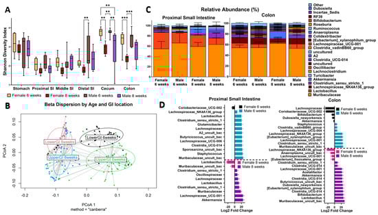 Sex and Age Differences Vary Between Upper and Lower GI. (A) Shannon alpha diversity throughout all collected GI locations for both sexes at 6 and 8 weeks old. Significance values as follows: ** p < 0.01, *** p < 0.001. Non-significant values are not labeled. (B) Beta dispersion analysis using Canberra method comparing upper and lower GI samples at 6 and 8 weeks old (p-val: 0.029). (C) Genus-level relative abundance plot of proximal small intestine and colon for both sexes at 6 and 8 weeks old. “Other” label refers to the sum of the rest of the features found in each group (beyond the top 23). “Uncultured” is a SILVA database term which refers to samples for which the genus-level taxonomic assignment was resolved, but this level was unassigned/unannotated in the SILVA database itself. Repeated labels correspond to different OTUs. (D) Taxa significantly associated with sex and proximal small intestine or colon calculated with DESeq2 R package (v.1.40.2).