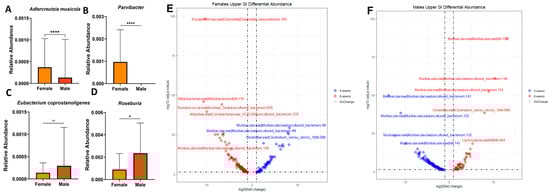 MaAslin2 analysis found that the most significantly associated taxa with increasing estradiol at 8 weeks were Adlercreutzia mucosicola, Eubacterium coprostanoligenes, Parvibacter, and Roseburia (Figure 2A–D). Based on these Maaslin2 identified significances in relation to estradiol, we then wanted to see whether these taxa were also associated with sex differences at 8 weeks. Adlercreutzia mucosicola was found at a significantly higher relative abundance in females than in males (Figure 2A). Adlercreutzia mucosicola is a Gram-positive anaerobe reported to inhabit the intestinal mucosa in mice [27,28]. Interestingly, Adlercreutzia mucosicola is known to metabolize the phytoestrogens daidzein and genistein to equol, a metabolite with the highest affinity to estrogen receptors [29]. Parvibacter was found at significantly higher levels in female mice than in male mice (Figure 2B). It is worth noting that it belongs to the family Eggerthellaceae, and is phylogenetically similar to the Alderceutzia genus, suggesting that it may have a similar impact on estrogenic activity [30]. Its only known species is Parvibacter caecicola, and the metabolites it produces have not been well-elucidated [27]. However, our analysis was not able to resolve down to this level. Eubacterium coprostanoligenes was found at a higher relative abundance in males, but not significantly so (Figure 2C). Eubacterium coprostanoligenes reduces cholesterol to coprostanol, leading to lower cholesterol absorption and increased fecal coprostanol [31]. Roseburia was found in a significantly higher concentration in males (Figure 2D). Interestingly, it has been shown to have a positive correlation to blood testosterone levels in healthy males, and a negative correlation to low butyrate and butyrate-producing genes, and Clostridium difficile infection [32]. We used DESeq2 to determine if the notable differences between females and males at 8 weeks of age in the upper GI, identified with MaAsLin2, were replicated with a second methodology. DESeq2 indicated that Adlercreutzia mucosicola and Parvibacter are found at a −5.1 (p = 3.74 × 10−10) and −6.4 (p = 7.14 × 10−14) log2-fold change in the upper GI of 8-week-old male mice than in female mice, respectively (Supplementary Figure S2). Interestingly, we also found that Adlercreutzia mucosicola is significantly decreased in males at 6 weeks of age than at 8 weeks of age (Figure 2F).