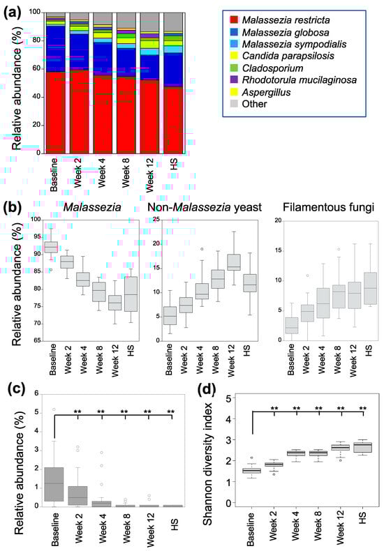 Fungi were classified as either Malassezia, non-Malassezia yeasts, or filamentous fungi. Figure 1b shows the relative abundances of each taxonomic category after dupilumab administration. Although the relative abundance of Malassezia species decreased (92.3 ± 2.5% at baseline and 8.0 ± 3.1% after 12 weeks), those of non-Malassezia yeasts (5.2 ± 2.3% at baseline and 16.0 ± 2.7% after 12 weeks) and filamentous fungi (2.3 ± 1.7% at baseline and 8.0 ± 3.1% after 12 weeks) increased. Among the non-Malassezia yeasts were C. prapsilosis, Debaryomyces hansenii, Naganishia diffluens, and R. mucilaginosa, whereas Aureobasidium, Aspergillus, Cladosporium, Fusarium, and Penicillium were the most prominent filamentous fungi (Figure S1 and Table S1). Although the relative abundance of the non-Malassezia yeasts increased with dupilumab treatment, the relative abundance of Candida albicans decreased with the dupilumab treatment (1.3 ± 1.2% at baseline to 0.0% ± 0.1% at 12 weeks) (Figure 1c). The relative abundance of each taxonomic category after 12 weeks of drug administration was comparable to that of the healthy individuals. The Shannon diversity index decreased over time following the administration of dupilumab (Figure 1d). Confirming the lowered abundance of Malassezia after dupilumab administration, the degree of skin colonization was verified using qPCR. The degree of skin colonization by Malassezia varies greatly among the subjects, but in all the subjects, this degree decreased after the administration of dupilumab (Figure 1e). The reduction rate was 43.1 ± 30.7%, 49.2 ± 28.0%, 47.3 ± 31.7%, and 43.9 ± 29.2% at 2, 4, 8, and 12 weeks, respectively. In addition, the degree of skin colonization by M. restricta and M. globosa also decreased (Figure 1f,g). The rate at which the Malassezia degree of skin colonization decreased after administering dupilumab did not exhibit a correlation with the baseline degree (r2 = 0.26, Figure 1h).
