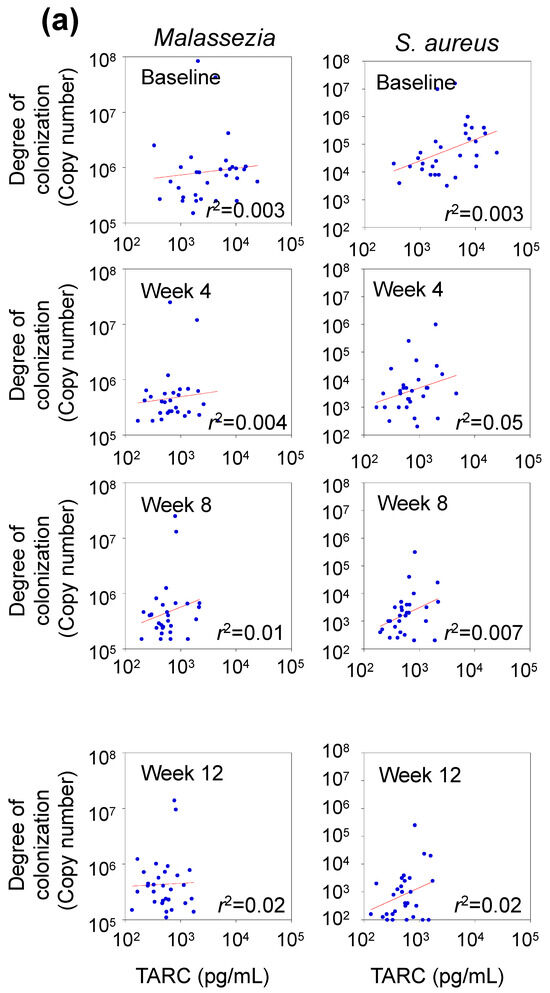 The baseline EASI was 27.0 ± 11.1, decreasing to 14.9 ± 9.3 after 12 weeks of dupilumab administration (Table 1). There was a weak correlation between the degree of skin colonization by Malassezia and EASI, with r2 = 0.21–0.53 (Figure 4a). Furthermore, there was a good correlation between the degree of skin colonization by S. aureus and EASI at all sampling times (r2 = 0.51–0.90). Both species had similar trends, with sample plots in the lower left of the graph.