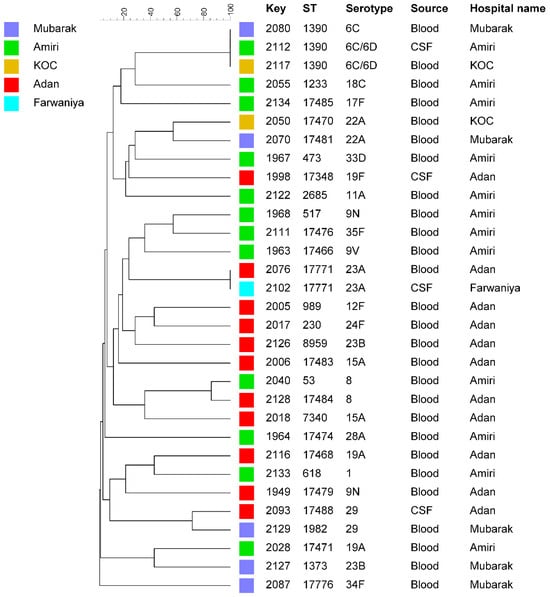 UPGMA tree based on MLST sequence data from 31 S. pneumoniae isolate. Similarity is presented in percentage using the scale bar in the upper left corner. The columns from left to right include, isolate number (key), MLST-based sequence type (ST), serotype, clinical source, and the hospital name where the isolate originated.