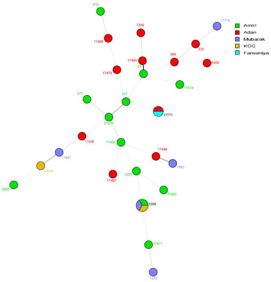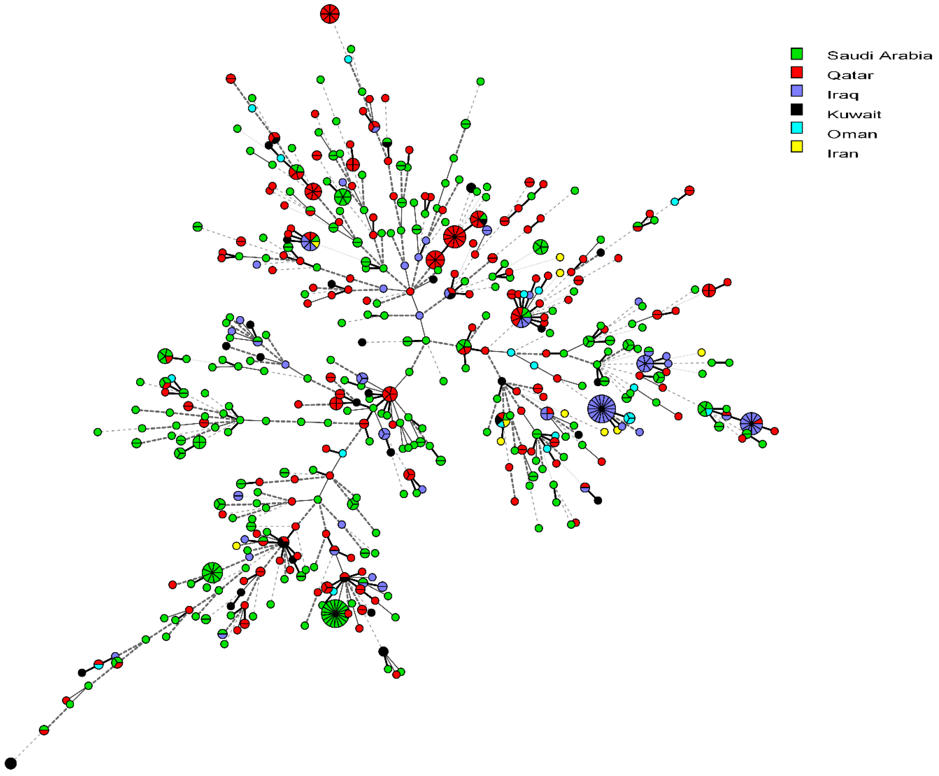 Minimum spanning tree showing the relationship of S. pneumoniae from Kuwait with 684 isolates from neighboring countries (Saudi Arabia, Qatar, Oman, Iraq, and Iran) available from the MLST website as of 3 October 2023. Each circle corresponds to a unique genotype, and lines between the circles represent relative distance between isolates. The sizes of the circles correspond to the number of isolates of the same genotype (ST). Connecting lines correspond to the number of allelic differences between genotypes, with a solid thick line connecting genotypes that differ in one locus, a solid thin line connecting genotypes that differ in two-three loci, a dashed line connecting genotypes that differ in four loci, and a dotted line connecting genotypes that differ in more than four loci.