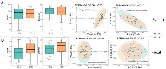 3.2. Ruminal and Fecal Bacterial Composition and Diversity