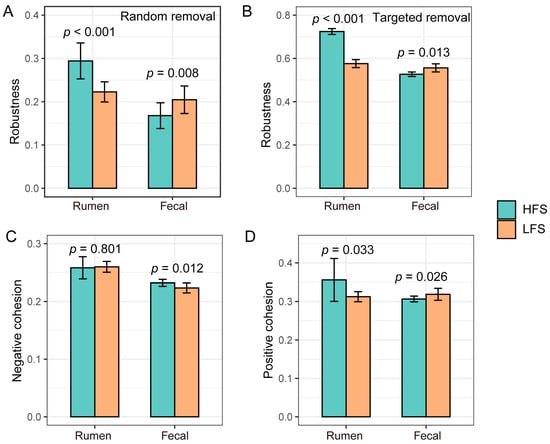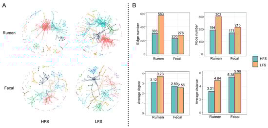 3.4. Difference in Rumen and Fecal Bacterial Community Networks and Topologies between Two Groups of Cows