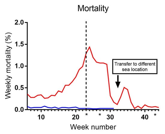 Weekly mortality (%) in sea cages 2 (blue) and 3 (red). The dotted line indicates a diet change to Aqura in C3 from week 23. Asterisks indicate the time of samplings (weeks 23, 27 and 43). Asterisks indicate the three sampling time points.