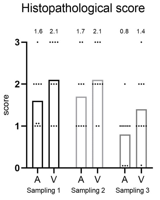 Histopathological score (from 0 to 3) of heart from fish in cage 3 at different sampling time points. A = atrium and V = ventricle. The mean score is shown above each bar.