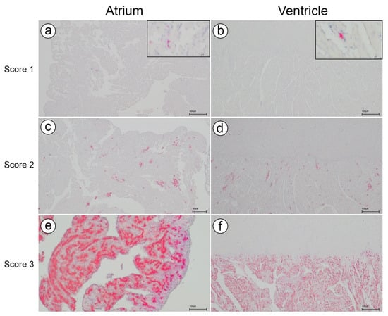 In situ hybridization for Piscine myocarditis virus (PMCV). Distribution of viral RNA in the atrium and ventricle across the different histopathological scores (1–3) in C3. (a,b) showing few and scattered positive cells (red) in the atrium and the spongious compartment of the ventricle, respectively. (c,d) showing multifocal positive cell clusters (red) in the atrium and the spongious compartment of the ventricle, respectively. (e,f) showing widespread and confluent positive cells in the atrium and the spongious compartment of the ventricle, respectively.