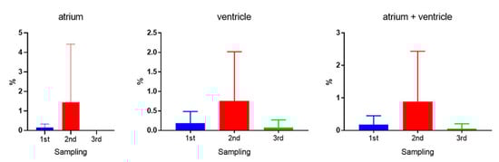 Quantification of PMCV RNA in the heart of fish in Cage 3. Area fraction virus (%) based on in situ hybridization targeting PMCV in the atrium, the ventricle and both compartments combined at the different sampling time points (first sampling—blue, second sampling—red, third sampling—green). The highest load was detected at the second sampling in both the atrium and the ventricle. The atrium was almost devoid of PMCV RNA (0.0019%) at sampling 3. The ventricle also had a low percentage of PMCV RNA at sampling 3 (0.08%).