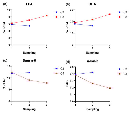 Fatty acid profile in heart tissue in pooled samples from C2 and C3. Each point represents values for a pooled sample of ten fish. (a) Shows the increase in EPA from sampling 1 to 3 in cage 3 (b) Shows the increase in DHA from sampling 1 to 3 in cage 3. (c) Shows the decrease in sum omega-6 in cage 3 from sampling 1 to 3. (d) Shows the decrease in n-6/n-3 ratio in cage 3 from sampling 1 to 3.