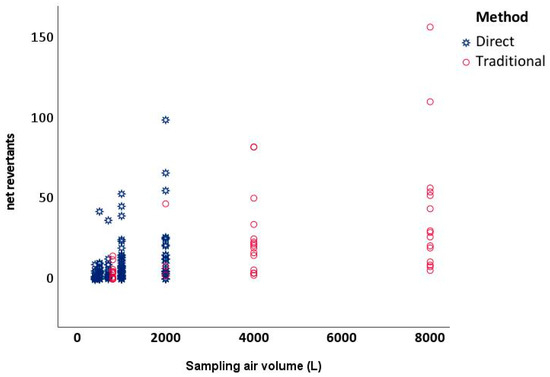 Scatter plot of the overall net revertants observed during the experiments both for the direct methods (three tested volumes) and the traditional methods (first three volumes tested).