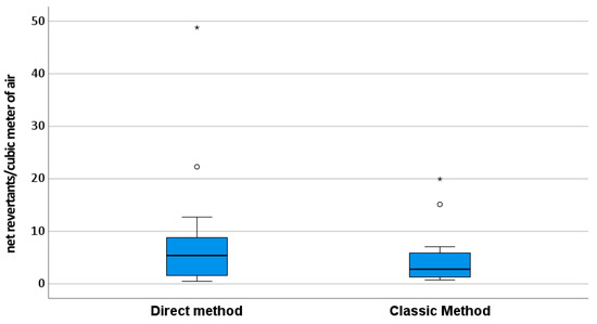 Box plot of the mutagenicity observed (Salmonella typhimurium TA98, TA1001, and YG1024 net revertants/m3) in the same sampling point and days with the two different methods: the direct method and the classic method. Circles represent the outliers, asterisks the extreme outliers.