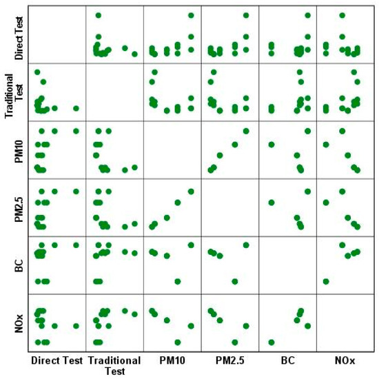 Dispersion matrix of the mutagenicity results obtained using direct and traditional tests with the different collected air pollution parameters.