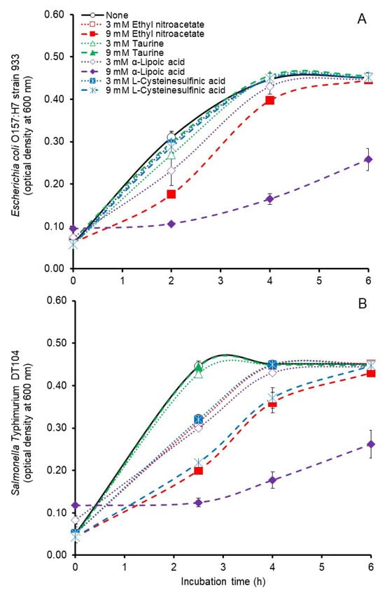 Growth curves of Escherichia coli strain 933 (A) and Salmonella Typhimurium DT104 (B) during anaerobic (100% nitrogen gas phase) pure culture in 0.1 M phosphate buffered tryptic soy broth (pH 6.7) supplemented without or with 3 or 9 mM ethyl nitroacetate, taurine, α-lipoic acid or L-cysteinesulfinic acid. Values at each time point are the means ± standard deviations from n = 3 cultures/treatment concentration.