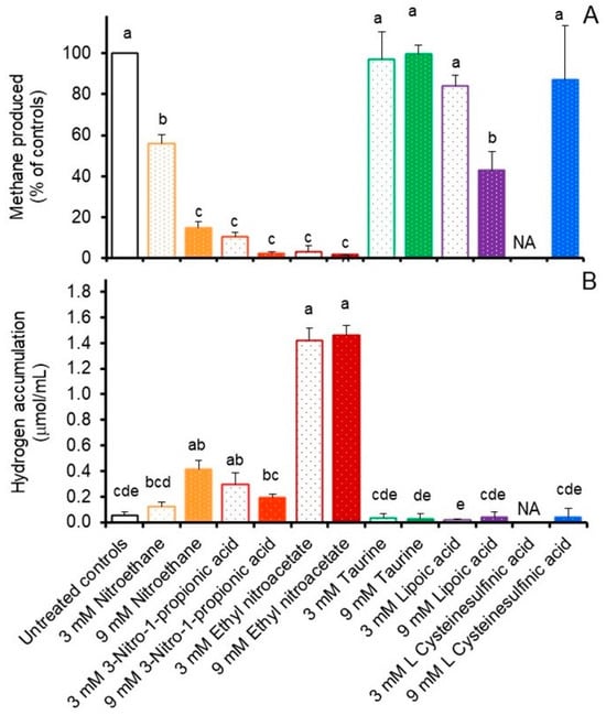 Effect of select compounds on ruminal methane production, expressed as % of controls (A), or hydrogen accumulation, expressed as µmol/mL (B) after 24 h anaerobic incubation of freshly collected rumen fluid at 39 °C in vitro. Values are least-squares means (±SD) from n = 3 cultures/treatment. Standard error of the mean was 4.410 for A and was 0.356 for B. Mean amounts of methane produced for controls ranged from 7.26 to 15.43 and averaged 11.6 ± 5.54 µmol/mL incubation fluid.NA; not available. Means (from n = 3 cultures/treatment concentration) with unlike lowercase letters differ (p < 0.05) using the LSMeans Differences with a Tukey’s Honestly Significant Difference calculation. Error bars represent standard deviations. NA; not available.