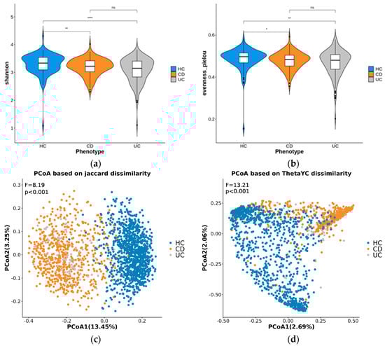 Violin plots displaying α−diversity indices (Shannon (a), and Pielou evenness (b)) of stool microbiome in the three disease groups. Significance in α−diversity variation between phenotypes was assessed using the Wilcoxon test (*, **, ****, and ns represent p < 0.05, p < 0.01, p < 0.0001, and non−significance respectively). The PCoA plots based on β−diversity indices: Jaccard dissimilarity (c) and thetaYC dissimilarity (d). F- and p-values were calculated by a PERMANOVA test with 1000 permutations.